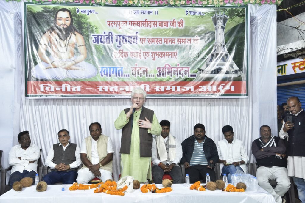 मुख्य अतिथि डॉ संदीप जैन ने अपने उद्बोधन में गुरु घासीदास जयंती की बधाई देते हुए कहा कि गुरु घासीदास बाबा ने समाज में व्याप्त कुरीतियों को दूर करने और सभी को सच के मार्ग पर चलने के लिए प्रेरित किया। उन्होंने मनखे मनखे एक समान के प्रेरक वाक्य के साथ यह संदेश दिया कि सभी मनुष्य एक समान है। इस अवसर पर समाज के संरक्षक खेमलाल खेलवार, डॉ. विष्णु भरद्वाज दशरथ पुरैना, कुमार खेलवार रामशरण खेलवार शंकर खेलवार सतनामी समाज के अध्यक्ष गणेश बांधे सचिव नंदकुमार ढीढी, भंडारी शिव खेलवार, राजेश भीमफोर डॉ. संतोष भरद्वाज टीकेश्वर गिलहरे, हीरालाल खेलवार, उपेंद्र (गोलू) खेलवार, सूरज बघेल रितेश खेलवार, आशीष भारद्वाज, अजय भरद्वाज, बृजमोहन खेलवार, नारायण बघेल, राजेश गिलहरे, सोनू घृतलहरे, नोहर टंडन हेमलाल,, संतोष ढ़ीढ़ी, ओंकार पूरेना, ऋतिक खेलवार, राजेश खेलवार, बल्लू भीमफोर खेमू खेलवार, रवि कुमार ढीढी शिवा खेलवार, छोटू घृतलहरे, शिवा बघेल अक्षय भारद्वाज, करण ,भीम, अर्जुन, सटीदार पन्ना जांगडे सहित समाज जन व बड़ी संख्या में श्रद्धालु गण उपस्थित थे।