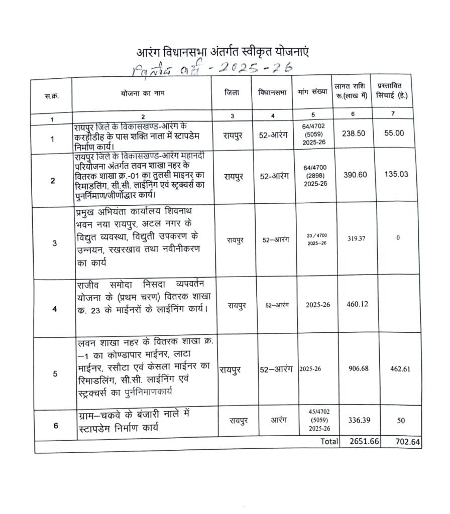 आरंग विधानसभा क्षेत्र में इस विभाग से ₹2651.66 लाख रुपए की मिली प्रशासकीय स्वीकृति-देखिये स्वीकृत कार्यो की सूची