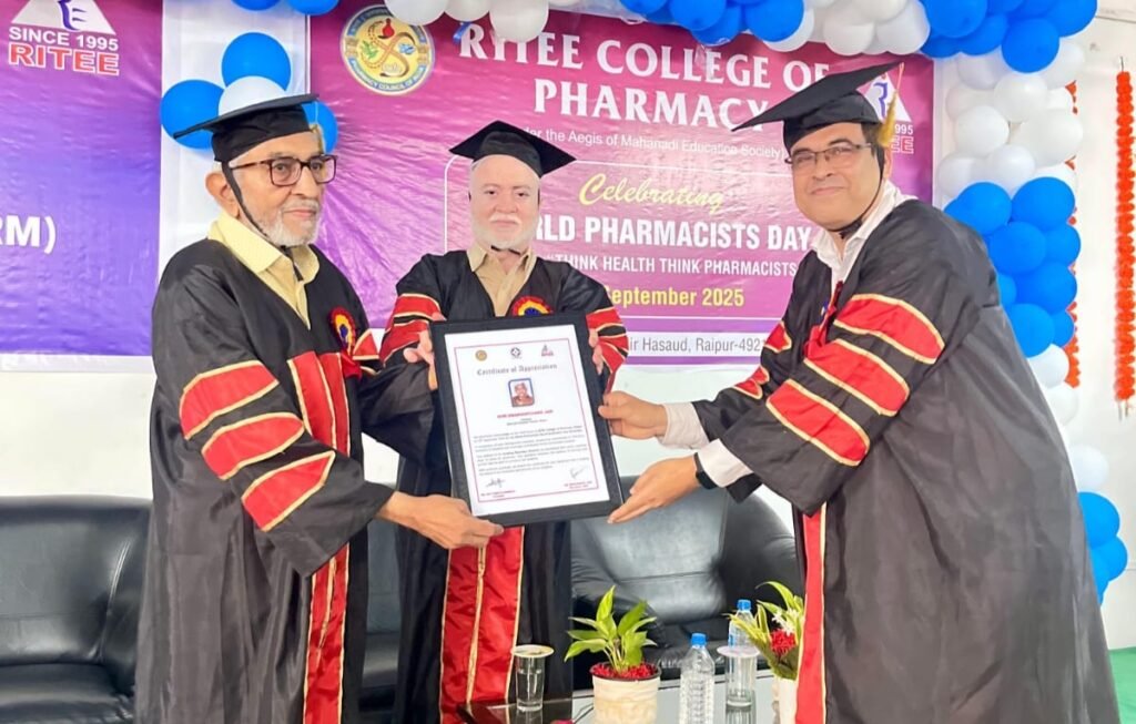 आरंग।आरआईटी कॉलेज ऑफ फार्मेसी, रायपुर द्वारा दीक्षांत समारोह (बैच 2021-25) एवं विश्व फार्मासिस्ट दिवस का संयुक्त आयोजन दिनांक 25 सितम्बर 2025 को उत्साहपूर्वक किया गया। कार्यक्रम का आयोजन कॉलेज के सेमिनार हॉल में सुबह 10:30 बजे से प्रारंभ हुआ, जिसकी थीम थी थिंक हेल्थ, थिंक फार्मासिस्टें”।
