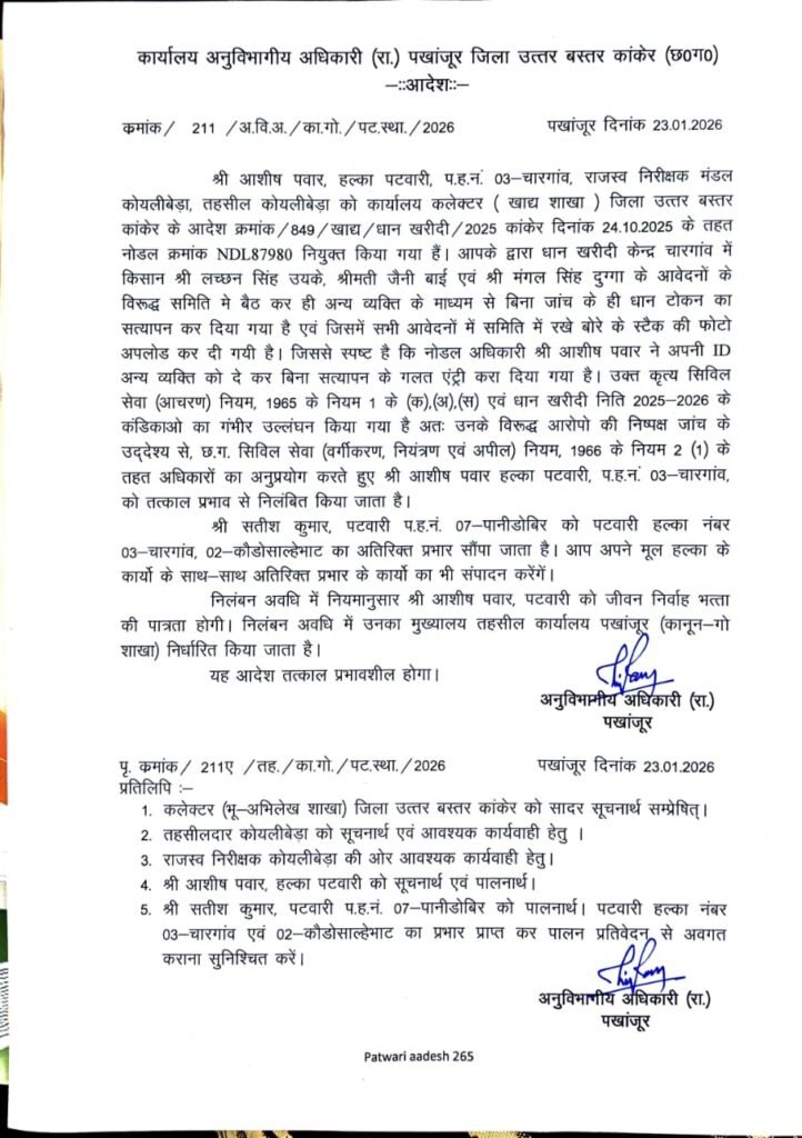 मामले को गंभीरता से लेते हुए SDM पखांजूर ने छत्तीसगढ़ सिविल सेवा (वर्गीकरण, नियंत्रण एवं अपील) नियम 1966 के तहत प्रदत्त शक्तियों का प्रयोग करते हुए दोनों पटवारियों को तत्काल प्रभाव से निलंबित कर दिया है। निलंबन अवधि में दोनों को नियमानुसार जीवन निर्वाह भत्ते की पात्रता होगी तथा उनका मुख्यालय तहसील कार्यालय पखांजूर निर्धारित किया गया है।