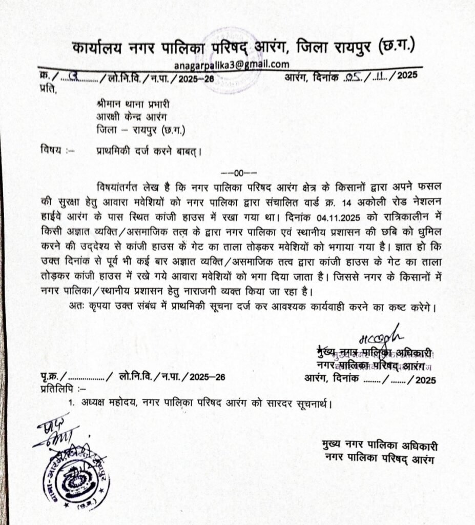 आरंग। नगर पालिका परिषद आरंग द्वारा संचालित कांजी हाउस का ताला अज्ञात व्यक्ति द्वारा तोड़ कर पशुधन को फिर छोड़ दिया गया है जिसकी सूचना नगर पालिका अध्यक्ष डॉ संदीप जैन को मिलने पर उन्होंने तत्काल पालिका प्रशासन को उक्त अज्ञात व्यक्ति के खिलाफ कार्यवाही करने आरंग थाने में प्राथमिकी दर्ज कराने के निर्देश दिए। जिस पर पालिका प्रशासन द्वारा उक्त अज्ञात व्यक्ति के खिलाफ प्राथमिकी दर्ज कर कार्यवाही करने की मांग थाना प्रभारी आरंग को पत्र लिख कर की गई।पत्र में बताया गया है कि नगर पालिका परिषद आरंग क्षेत्र के किसानों द्वारा अपने फसल की सुरक्षा हेतु आवारा मवेशियों को नगर पालिका द्वारा संचालित वार्ड क्र. 14 अकोली रोड नेशलन हाईवे आरंग के पास स्थित कांजी हाउस में रखा गया था। दिनांक 04.11.2025 को रात्रिकालीन में किसी अज्ञात व्यक्ति/असमाजिक तत्व के द्वारा नगर पालिका एवं स्थानीय प्रशासन की छबि को धुमिल करने की उद्देश्य से कांजी हाउस के गेट का ताला तोड़कर मवेशियों को भगाया गया है। ज्ञात हो कि उक्त दिनांक से पूर्व भी कई बार अज्ञात व्यक्ति / असमाजिक तत्व द्वारा कांजी हाउस के गेट का ताला तोड़कर कांजी हाउस में रखे गये आवारा मवेशियों को भगा दिया जाता है। जिससे नगर के किसानों द्वारा नगर पालिका/स्थानीय प्रशासन हेतु नाराजगी व्यक्त किया जा रहा है।नगर पालिका प्रशासन द्वारा प्राथमिकी सूचना दर्ज कर आवश्यक कार्यवाही करने की मांग की गई है।
