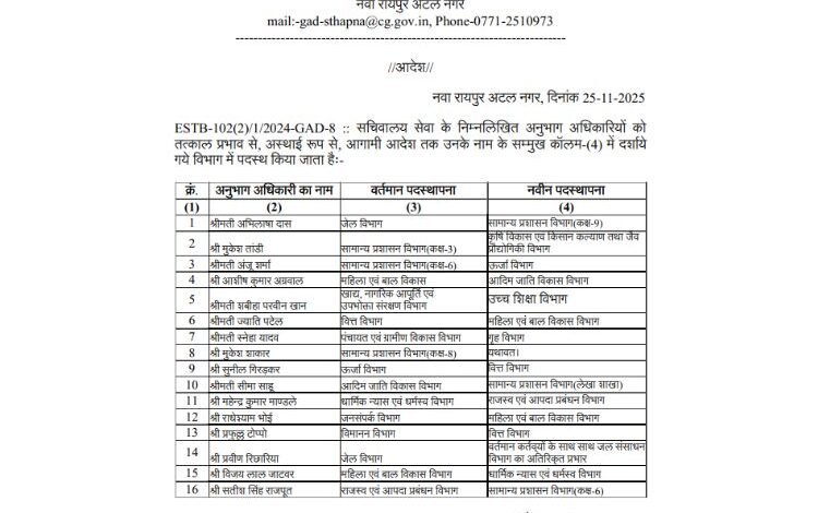 रायपुर। छत्तीसगढ़ में बड़ा प्रशासनिक फेरबदल किया गया है। सामान्य प्रशासन विभाग की ओर से जारी अधिसूचना के अनुसार, राज्य के 16 अधिकारियों का तबादला किया गया है। सचिवालय सेवा के 16 अनुभाग अधिकारियों को तत्काल प्रभाव से अगले आदेश तक अलग अलग पदों पर पदस्थ किया गया है। देखें सूची..