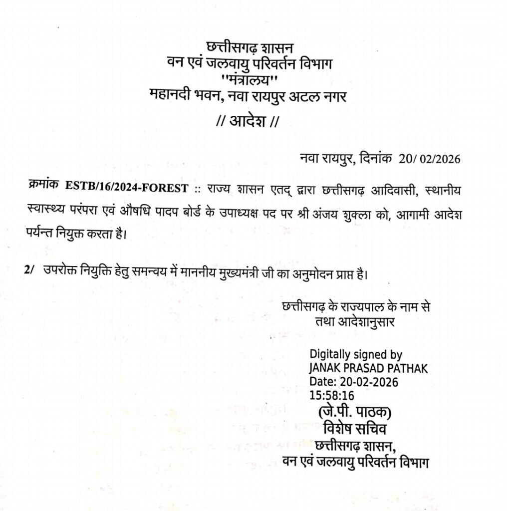 आरंग।विष्णुदेव साय सरकार ने भाजपा नेता अंजय शुक्ला को बड़ी जिम्मेदारी दी है। उन्हें वनौषधि पादप बोर्ड का उपाध्यक्ष बनाया गया है।छत्तीसगढ़ शासन के वन एवं जलवायु परिवर्तन विभाग ने आदेश जारी कर अंजय शुक्ला को छत्तीसगढ़ आदिवासी, स्थानीय स्वास्थ्य परंपरा एवं औषधि पादप बोर्ड का उपाध्यक्ष नियुक्त किया है। यह नियुक्ति आगामी आदेश तक प्रभावी रहेगी।नवा रायपुर स्थित मंत्रालय से 20 फरवरी 2026 को जारी आदेश के अनुसार, उक्त नियुक्ति के लिए मुख्यमंत्री की स्वीकृति प्राप्त है। आदेश छत्तीसगढ़ के राज्यपाल के नाम से जारी किया गया है।
