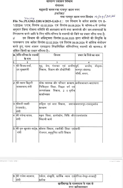 रायपुर – छत्तीसगढ़ सरकार ने साय कैबिनेट विस्तार के बाद मंत्रियों के जिलों के प्रभार का बंटवारा कर दिया है। मुख्यमंत्री विष्णु देव साय की अगुवाई वाली भाजपा सरकार ने नए मंत्रियों को जिम्मेदारियां सौंपते हुए आदेश जारी किए हैं, जिससे कई महत्वपूर्ण जिलों में प्रभार बदले गए हैं। राजनीतिक और प्रशासनिक हलकों में इस फेरबदल को लेकर चर्चा तेज है, क्योंकि इससे विकास योजनाओं और सुरक्षा उपायों पर नई रणनीति की उम्मीद जताई जा रही है।