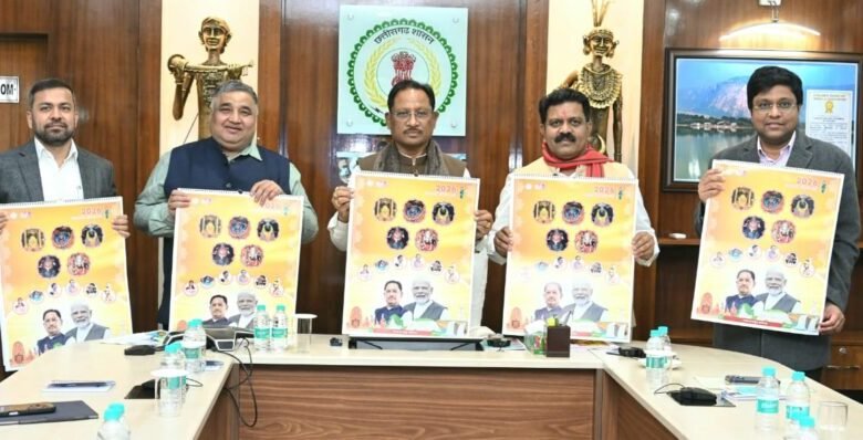रायपुर। मुख्यमंत्री विष्णु देव साय ने राजधानी रायपुर स्थित मुख्यमंत्री निवास कार्यालय में वर्ष 2026 के शासकीय कैलेंडर का विमोचन किया। वर्ष 2026 को राज्य सरकार द्वारा ‘महतारी गौरव वर्ष’ के रूप में मनाया जा रहा है। इसी थीम पर आधारित यह कैलेंडर सशक्त एवं समृद्ध छत्तीसगढ़ के संकल्प को अभिव्यक्त करता है।