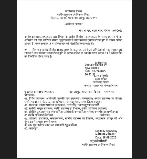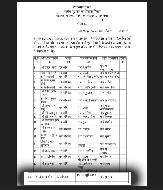 दरअसल, नगरीय प्रशासन एवं विकास विभाग की तरफ से जारी ट्रांसफर लिस्ट में दल्लीराजहरा नगर पालिका में पदस्थ रहे उप अभियंता योगानंद सोम का दबादला नगर पंचतायत तुमगांव किया है। जिनका दो महीने पहले निधन हो गया था। लेकिन विभाग ने लापरवाही करते हुए उनकी फाइल और रिकॉर्डस को अपडेट नहीं किया और जीवित मानकर ट्रांसफर आदेश जारी कर दिया।