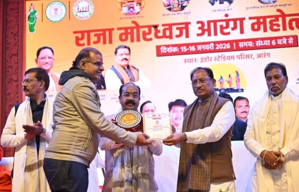 आरंग। इंडोर स्टेडियम आरंग में आयोजित दो दिवसीय राजा मोरध्वज महोत्सव के समापन समारोह के मुख्य अतिथि मुख्यमंत्री विष्णुदेव साय ने सेवा, दान, खेल, शिक्षा, कला और समाज सेवा के क्षेत्र मेंउल्लेखनीय योगदान देने वाली विभूतियों को सम्मानित किया। दानशीलता के क्षेत्र में उत्कृष्ट योगदान के लिए स्व. भागीरथी अग्रवाल की स्मृति में उनके पोते आशुतोष अग्रवाल को सम्मानित किया गया। आशुतोष अग्रवाल के स्व पुरुषोत्तम लाल अग्रवाल द्वारा स्वयं की भूमि क्रय कर स्कूल निर्माण हेतु दान देने तथा मुक्तिधाम में बैठने के लिए शेड निर्माण जैसे जनकल्याणकारी कार्यों को विशेष रूप से रेखांकित किया गया।गौ सेवा के क्षेत्र में आरंग निवासी राहुल जोशी, बागेश्वर नाथ गौशाला के संचालक, को सम्मान प्रदान किया गया। उन्होंने दुर्घटनाग्रस्त एवं बेसहारा गौवंश की सेवा, उपचार और संरक्षण में अनुकरणीय योगदान दिया है।खेल के क्षेत्र में रीवा निवासी 88 वर्षीय भुवन लाल नाशिने एवं उनकी धर्मपत्नी श्रीमती रुखमणी नाशिने को सम्मानित किया गया। भुवन लाल नाशिने अब तक 14 राष्ट्रीय मास्टर एथलेटिक्स प्रतियोगिताओं सहित विभिन्न प्रतियोगिताओं में 32 स्वर्ण एवं 4 रजत पदक अर्जित कर चुके हैं। इसी कारण वे खेल जगत में ‘लौह पुरुष’ के नाम से प्रसिद्ध हैं।शिक्षा के क्षेत्र में आरंग निवासी मुरली मनोहर देवांगन को प्रदेश के युवाओं को प्रतियोगी परीक्षाओं के लिए तैयार करने में विशिष्ट योगदान हेतु सम्मान मिला।कला एवं संगीत के क्षेत्र में प्रभु लाल सहानी, प्रभु बैंड पार्टी के संस्थापक, एवं उनके सुपुत्र लल्ला सहानी को छत्तीसगढ़ के साथ-साथ उड़ीसा, महाराष्ट्र और मध्यप्रदेश सहित कई राज्यों में अपनी कला और संगीत के माध्यम से आरंग की ख्याति बढ़ाने के लिए सम्मानित किया गया।समाज सेवा के क्षेत्र में पीपला फाउंडेशन को जलदान महाअभियान, शिक्षा दान एवं मुक्तिधामों की स्वच्छता जैसे कार्यों के लिए सम्मान प्रदान किया गया।इस अवसर पर महोत्सव के संयोजक केबिनेट मंत्री गुरु खुशवंत साहेब नगर पालिका अध्यक्ष डॉ संदीप जैन सहितइस अवसर पर उप मुख्यमंत्री अरुण साव, रायपुर सांसद बृजमोहन अग्रवाल , विजय बघेल, सतनामी समाज के धर्मगुरु बालदास साहेब,आयोजन के संयोजक केबिनेट मंत्री गुरु खुशवंत साहेब, ध्रुव कुमार मिर्धा एवं पीठाधीश राजीव लोचन महराज, विधायक रोहित साहू, इंद्र कुमार साहू, शालिनी राजपूत, आरंग पालिका अध्यक्ष डॉ संदीप जैन, जनपद अध्यक्ष टाकेश्वरी मुरली साहू सहित जनप्रतिनिधि, अधिकारी, सामाजिक कार्यकर्ता एवं बड़ी संख्या में नागरिक उपस्थित रहे। समापन समारोह सम्मान, सेवा और विकास की नई सौगातों के साथ ऐतिहासिक बन गया।
