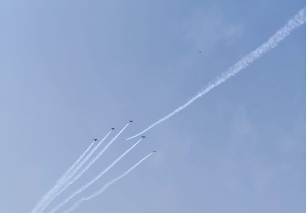 इस अवसर पर सैकड़ों नागरिकों और स्कूली विद्यार्थियों ने एयरोबेटिक शो का लुत्फ उठाया। बच्चों ने भारतीय वायु सेना के प्रति गर्व और उत्साह व्यक्त करते हुए “जय हिन्द” के नारे लगाए।राज्योत्सव के अंतर्गत आयोजित इस विशेष प्रदर्शन का उद्देश्य युवाओं में देशभक्ति और सैन्य सेवाओं के प्रति प्रेरणा जागृत करना है। सूर्यकिरण टीम के असाधारण कौशल और सटीक समन्वय ने सभी का मन मोह लिया।आयोजन स्थल पर सुरक्षा और यातायात व्यवस्था के पुख्ता इंतजाम किए गए थे। आमजन अब बुधवार सुबह 10 से होने वाले मुख्य एयरो शो का बेसब्री से इंतजार कर रहे हैं, जब सूर्यकिरण टीम अपने पूरे शौर्य के साथ राज्योत्सव समारोह में आकाश को तिरंगे रंगों से रंग देगी।