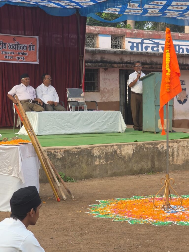 आरंग।राष्ट्रीय स्वयंसेवक संघ के शताब्दी वर्ष 100 वर्ष पूर्ण होने के अवसर पर आज गुल्लू मंडल के ग्राम फरफौद में श्री विजयादशमी उत्सव एवं भव्य पथ संचलन शस्त्र पूजन अत्यंत उत्साह एवं अनुशासन के साथ संपन्न हुआ, यह आयोजन संघ के शताब्दी वर्ष की दिशा में समाज संगठन सेवा और राष्ट्र जागरण के उद्देश्य से किया गया।कार्यक्रम का शुभारंभ ग्राम के सरस्वती शिशु मंदिर के प्रांगण में शाखा लगने के बाद हुआ कार्यक्रम में रायपुर ग्रामीण जिला के जिला संघ चालक देवेंद्र सिंह ठाकुर, गोपाल यादव प्रांत सह कार्यवाह छत्तीसगढ़ प्रांत एवं मुख्य अतिथि अनिल किशोर पुष्पकार गणेश राम हाई स्कूल गुल्लू के प्रधानाचार्य के मार्गदर्शन में उपस्थित स्वयंसेवकों को प्रेरणादाई विचार प्राप्त हुए।मुख्य अतिथि अनिल किशोर पुष्पकार ने कहा कि राष्ट्रीय स्वयंसेवक संघ स्वयं की प्रेरणा से राष्ट्र निर्माण व्यक्तित्व निर्माण सामाजिक धार्मिक आध्यात्मिक मूल्य हेतु अनवरत 100 वर्ष से कार्य कर रहा है संघ के स्वयंसेवक शाखा की माध्यम से नित्य प्रतिदिन संस्कार ज्ञान एवं बुद्धि का विकास करते हुए इसका उपयोग राष्ट्र की सेवा के लिए कर रहा है एक राष्ट्रव्यापी संस्था है जिसकी तरफ पूरे विश्व में और कोई भी संस्था नहीं