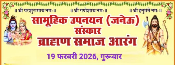 आरंग।प्रतिवर्षानुसार इस वर्ष भी ब्राह्मण समाज आरंग द्वारा सामूहिक उपनयन (जनेऊ) संस्कार का आयोजन फाल्गुन शुक्ल पक्ष द्वितीय 19 फरवरी 2026, गुरूवार को किया गया है जिसमें 15 बटुकों का उपनयन (जनेऊ) संस्कार सम्पन्न होगा।कार्यक्रम के मुख्य अतिथि सुशांत शुक्ला,विधायक विधानसभा क्षेत्र बेलतरा होंगे। कार्यक्रम की अध्यक्षता डॉ. संदीप जैन अध्यक्ष नगर पालिका परिषद आरंग करेंगे। अति विशिष्ट अतिथि के रूप में ध्रुव कुमार मिर्धा अध्यक्ष चर्मकार शिल्पकार बोर्ड छ.ग. महेन्द्र पडित महामंत्री भाजपा जिला धमतरी शामिल होंगे। श्रीमती खुशबु राकेश शर्मा, पार्षद नगर पालिका परिषद आरंग, उमाकांत यादव पार्षद नगर पालिका परिषद आरंग, संतोष लोधी पार्षद नगर पालिका परिषद आरंग विशिष्ट अतिथि के रूप में उपस्थित रहेंगे।उपनयन (जनेऊ) संस्कार प्रातः 9:30 बजे से आचार्यद्वय – पं.पुरूषोत्तम शर्मा (परशु महराज) जी पं.भानुप्रताप शर्मा जी के सानिध्य में ब्राह्मण समाज भवन, खरोरा रोड, आरंग जिला-रायपुर (छ.ग.) में सम्पन्न होगा।ब्राह्मण समाज आरंग,ब्राह्मण समाज महिला प्रकोष्ठ आरंग तथा ब्राह्मण समाज युवा प्रकोष्ठ आरंग के पदाधिकारी एवं सदस्य गण कार्यक्रम को सफल बनाने में जुटे हुए है।