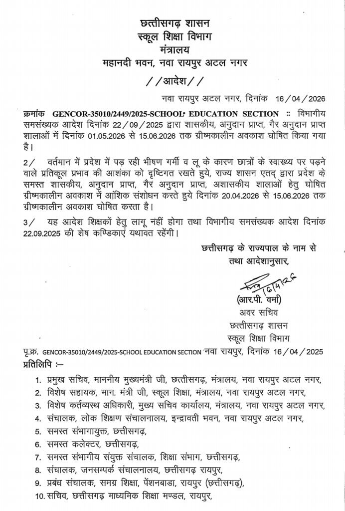 रायपुर 16 अप्रैल 2026/प्रदेश में बढ़ती भीषण गर्मी और लू के प्रभाव को ध्यान में रखते हुए बच्चों के स्वास्थ्य की सुरक्षा को सर्वोच्च प्राथमिकता देते हुए मुख्यमंत्री श्री विष्णुदेव साय के निर्देश पर स्कूलों के ग्रीष्मकालीन अवकाश की अवधि में आंशिक संशोधन किया है। मुख्यमंत्री श्री विष्णु देव साय ने कहा कि बढ़ती भीषण गर्मी में बच्चों की सेहत की सुरक्षा हर हाल में सुनिश्चित करना हम सब की जिम्मेदारी है। बच्चों के स्वास्थ्य और सुरक्षा को ध्यान में रखते हुए पूर्व निर्धारित ग्रीष्मकालीन अवकाश को पहले लागू करने का निर्णय लिया है, ताकि इस भीषण गर्मी में बच्चों की सेहत सुरक्षित रह सके।स्कूल शिक्षा विभाग मंत्रालय, महानदी भवन, नवा रायपुर अटल नगर द्वारा जारी आदेश के अनुसार, पूर्व में दिनांक 01 मई 2026 से 15 जून 2026 तक घोषित ग्रीष्मकालीन अवकाश में संशोधन करते हुए अब दिनांक 20 अप्रैल 2026 से 15 जून 2026 तक अवकाश घोषित किया गया है। यह आदेश प्रदेश के समस्त शासकीय, अनुदान प्राप्त, गैर अनुदान प्राप्त एवं अशासकीय शालाओं पर लागू होगा।