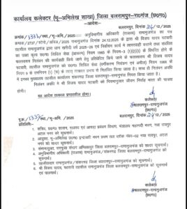 बलरामपुर। धान खरीदी कार्य में लापरवाही करने वाले 2 पटवारियों के खिलाफ बलरामपुर कलेक्टर ने सख्त रुख अपनाया है। कलेक्टर ने तहसील रामचंद्रपुर में पदस्थ पटवारी बंधन राम और तहसील रामानुजगंज में पदस्थ पटवारी विजय यादव को निलंबित कर दिया है।
