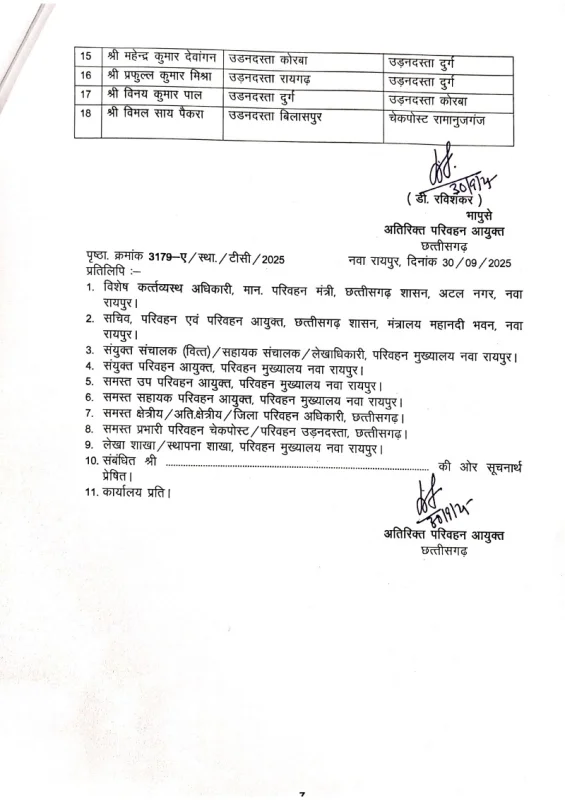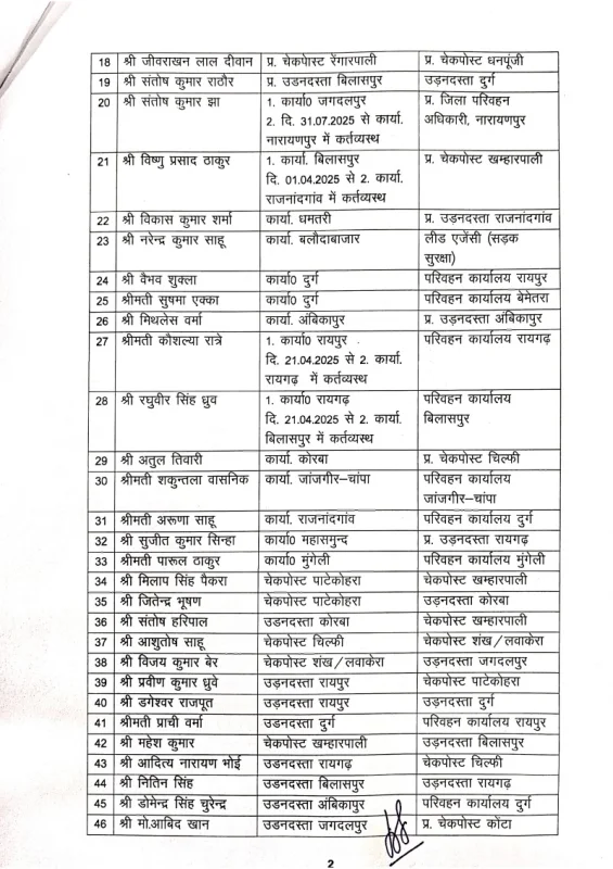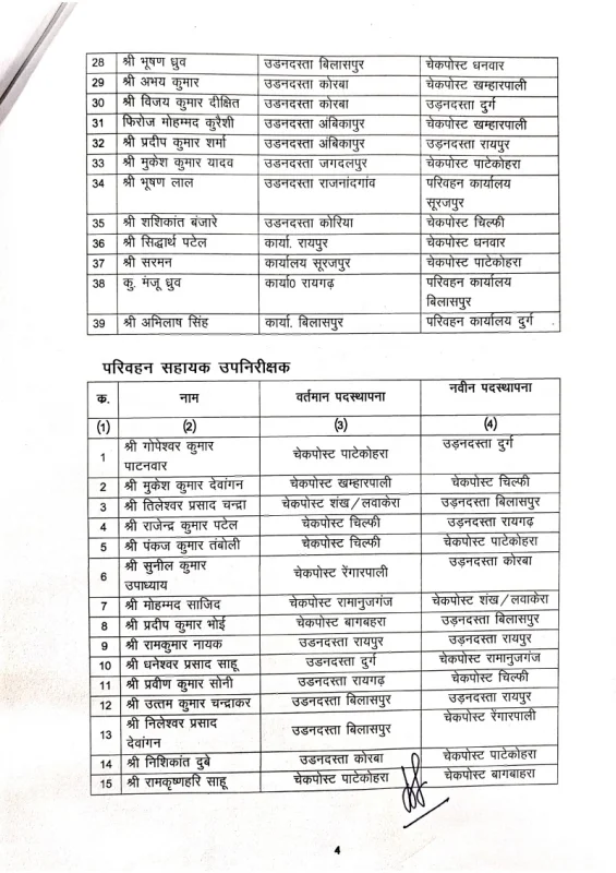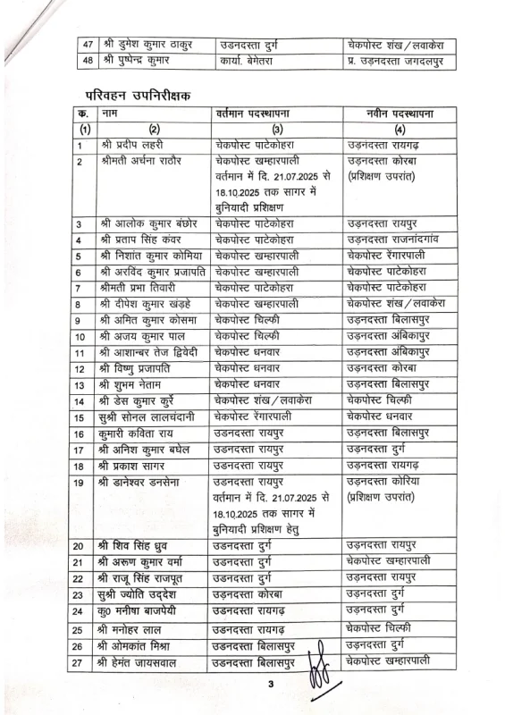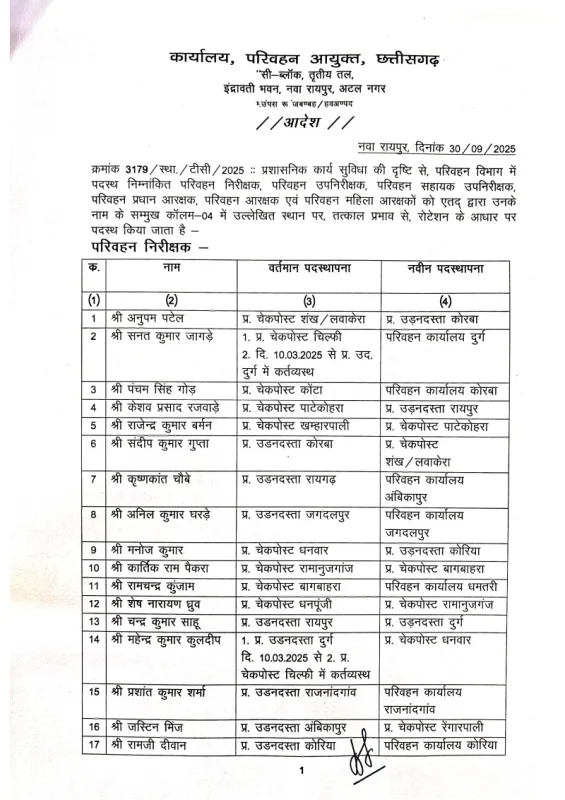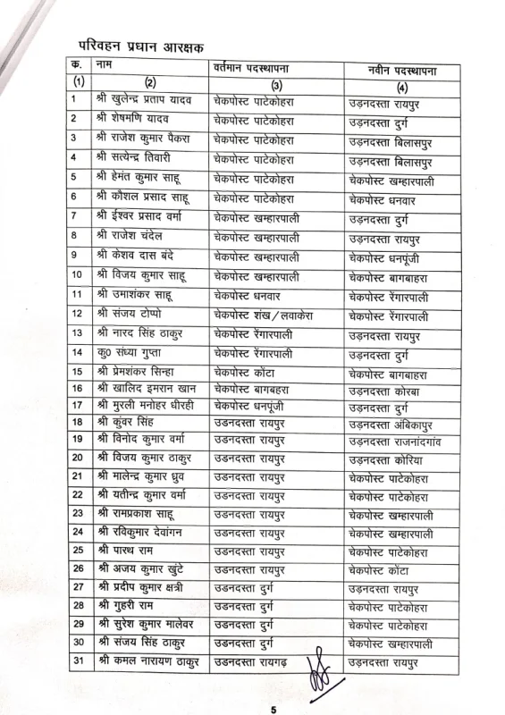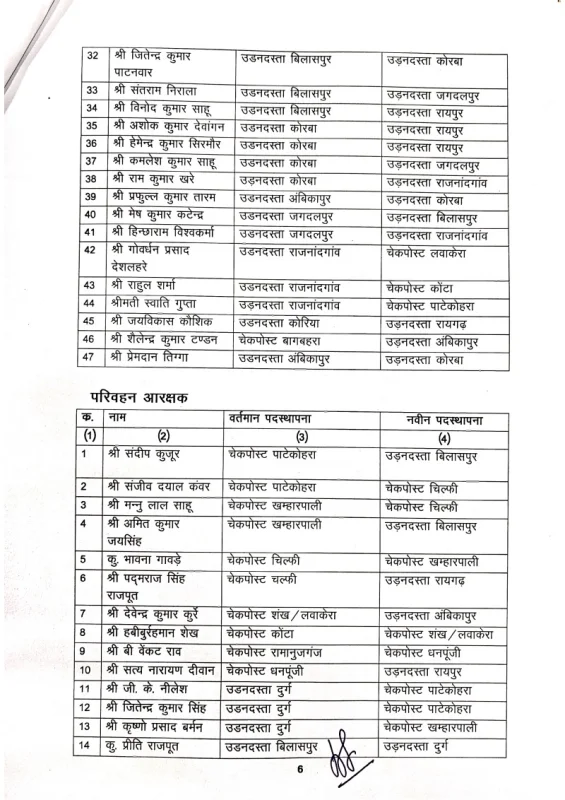 रायपुर। छत्तीसगढ़ में परिवहन विभाग में एक बड़ा प्रशासनिक फेरबदल किया गया है। विभाग ने कुल 167 अधिकारियों-कर्मचारियों का तबादला आदेश जारी किया है। इसमें परिवहन निरीक्षक, उपनिरीक्षक, सहायक उपनिरीक्षक, प्रधान आरक्षक, आरक्षक और महिला आरक्षक शामिल हैं।